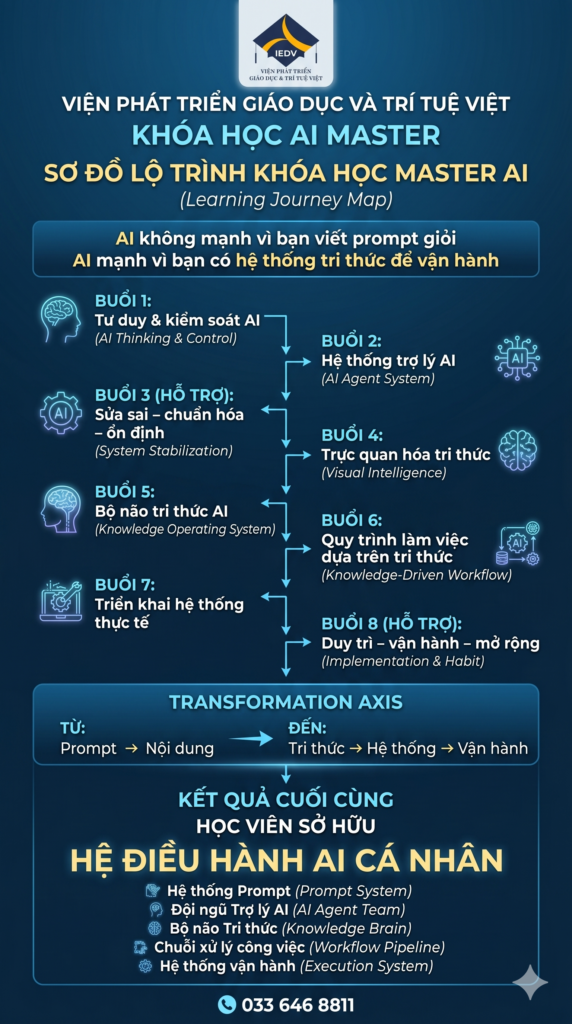 Khóa học AI MASTER (SIGNATURE) được xây dựng để giải quyết tận gốc điểm nghẽn này: Biến AI từ công cụ rời rạc thành một hệ điều hành trí tuệ cá nhân – vận hành công việc mỗi ngày.
